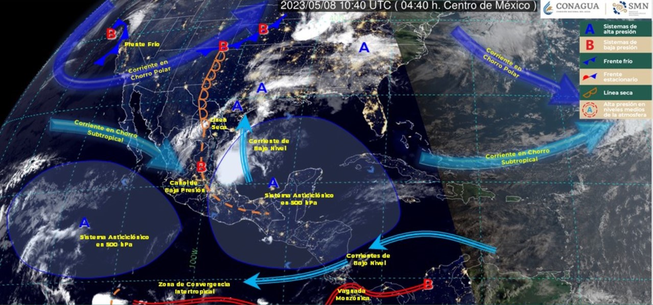 Un canal de baja presión sobre el interior del país, la entrada de humedad de ambos océanos e inestabilidad en niveles altos de la atmósfera, originarán chubascos y lluvias puntuales fuertes en zonas del centro, oriente, occidente y sur de México, esperándose lluvias puntuales muy fuertes en Puebla e Hidalgo.