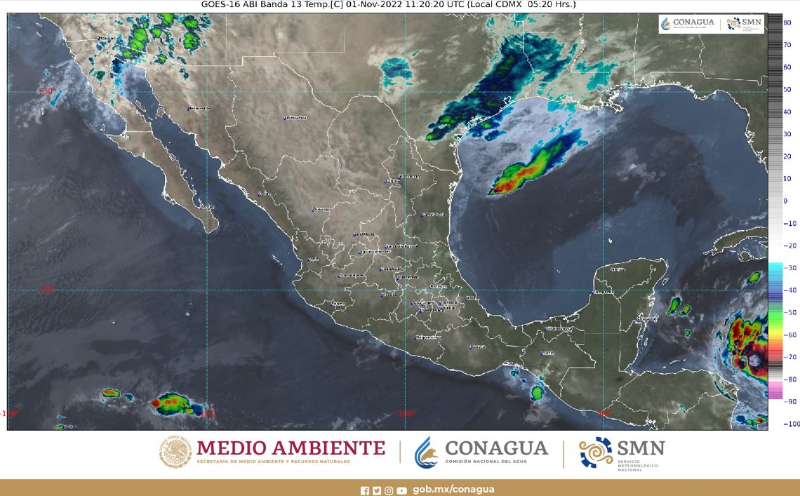 Por otra parte, la aproximación de la tormenta tropical «Lisa” hacia el noroeste del mar Caribe, propiciará lluvias puntuales muy fuertes en Quintana Roo y chubascos en Yucatán y Campeche, así como rachas de viento de 40 a 50 km/h y oleaje de 1 a 2 metros de altura en costas de la Península de Yucatán.