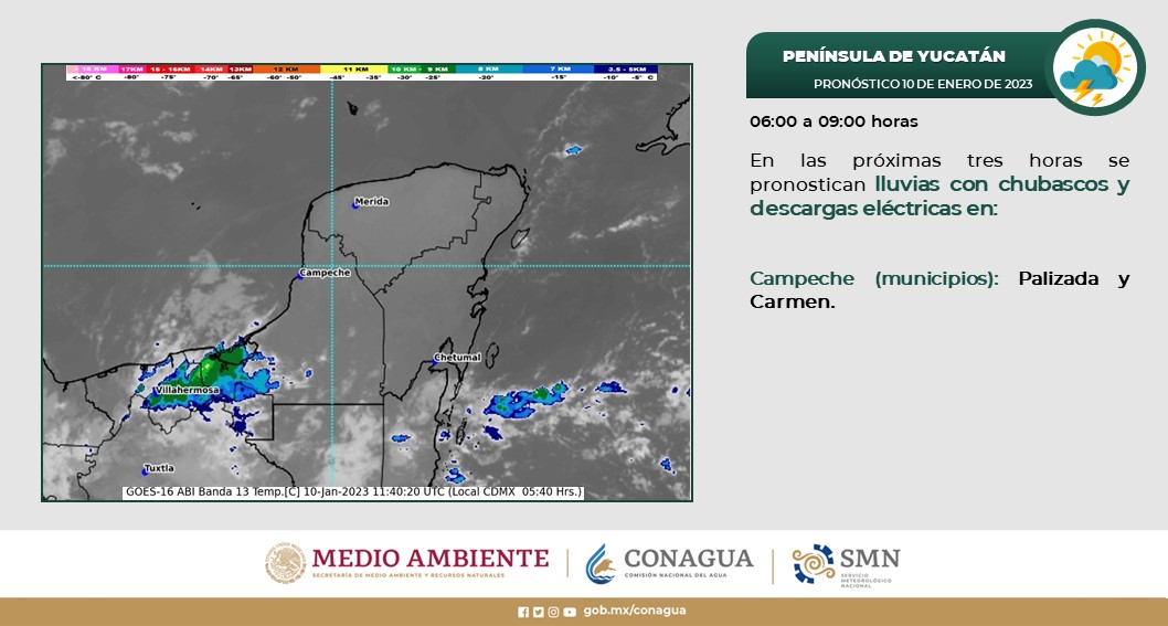 Península de Yucatán: Cielo medio nublado a nublado, con chubascos con posibles descargas eléctricas en Campeche y Quintana Roo, así como lluvias aisladas en Yucatán. Por la mañana, ambiente templado y cálido por la tarde. Viento del noreste de 20 a 35 km/h en la región, con rachas de 40 km/h en costas de Campeche.