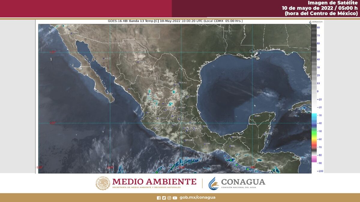 Pacífico Sur: Cielo parcialmente nublado por la mañana, nublado por la tarde con lluvias puntuales muy fuertes en Chiapas, lluvias fuertes en Oaxaca y lluvias aisladas en Guerrero, todas con descargas eléctricas y posible caída de granizo. Ambiente fresco a templado por la mañana y caluroso a muy caluroso por la tarde. Viento de componente sur de 15 a 30 km/h en la región, con rachas de 40 a 60 km/h en el Istmo y Golfo de Tehuantepec.