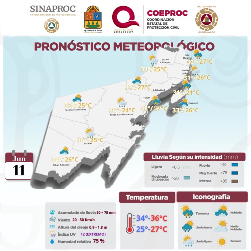 Pronóstico del clima para hoy martes 11 de junio 2024 en Quintana Roo. Para este día, un canal de baja presión sobre el noreste, centro y occidente del país, en interacción con el ingreso de humedad de ambos litorales y con la corriente en chorro subtropical, ocasionarán lluvias y chubascos acompañados de descargas eléctricas y posible caída de granizo (de diferente tamaño).