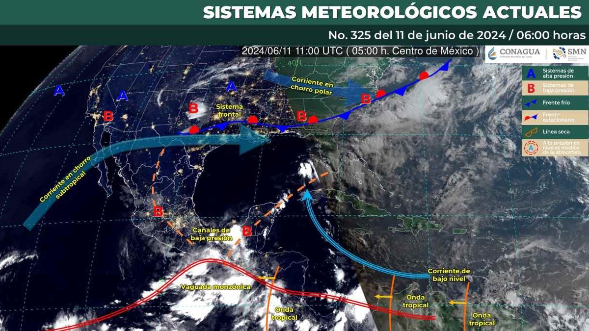 Por otra parte, un centro de baja presión sobre la Península de Yucatán en combinación con un canal de baja presión sobre el sureste de México y con la vaguada monzónica extendida muy próxima a las costas del Pacífico Sur Mexicano, producirán lluvias puntuales intensas en Chiapas, Campeche, Yucatán y Quintana Roo y puntuales muy fuertes en Oaxaca y Tabasco.