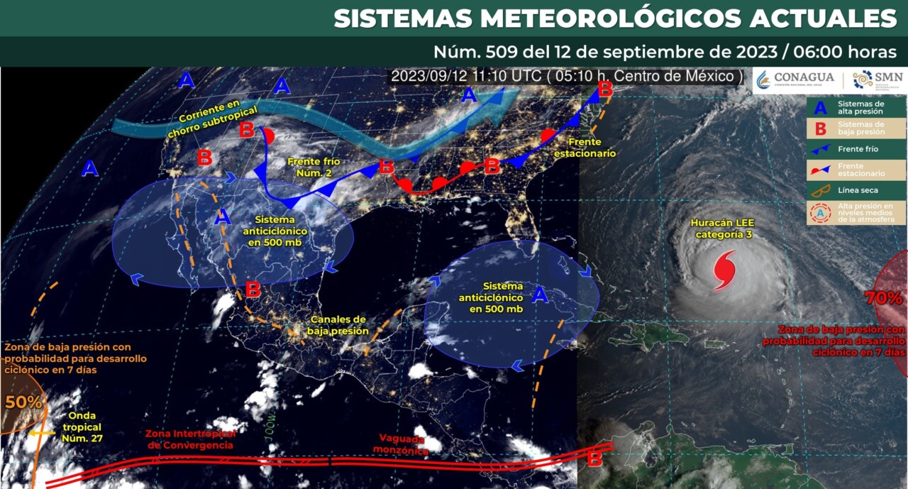 Pronóstico del clima para hoy martes 12 de septiembre 2023 en Quintana Roo. Este día continuará el monzón mexicano sobre el noroeste de México, así como canales de baja presión que prevalecerán sobre el centro y sureste mexicano, aunado al ingreso de humedad de ambos litorales y el nuevo frente frío número 2 sobre la frontera norte del territorio nacional, producirán lluvias muy fuertes en Tabasco y Chiapas; lluvias fuertes en Sonora, Sinaloa, Nayarit, Durango, Veracruz, Oaxaca y Campeche.