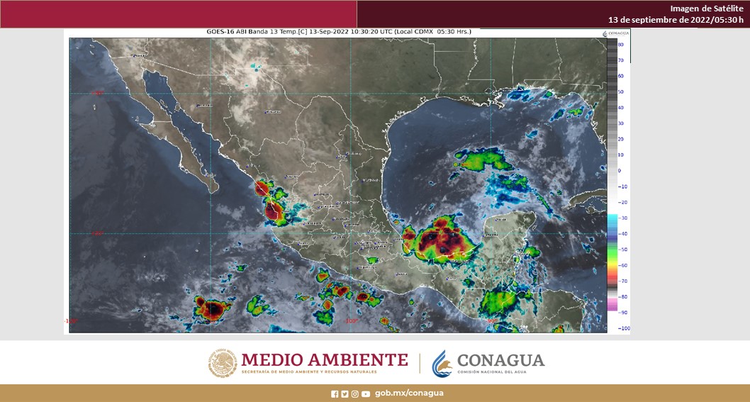 Pacífico Sur: Cielo nublado la mayor parte del día, con probabilidad de lluvias puntuales fuertes con descargas eléctricas por la mañana en zonas de Oaxaca. Ambiente templado por la mañana y fresco con bancos de niebla en zonas serranas de la región. Por la tarde, lluvias puntuales intensas en Oaxaca y Chiapas, además de lluvias muy fuertes en Guerrero; todas con descargas eléctricas y posible caída de granizo. Las lluvias podrían generar incremento en los niveles de ríos y arroyos, así como ocasionar deslaves e inundaciones, ambiente de cálido a caluroso. Viento de dirección variable de 10 a 20 km/h en la región, con rachas de hasta 40 km/h en zonas de tormenta.