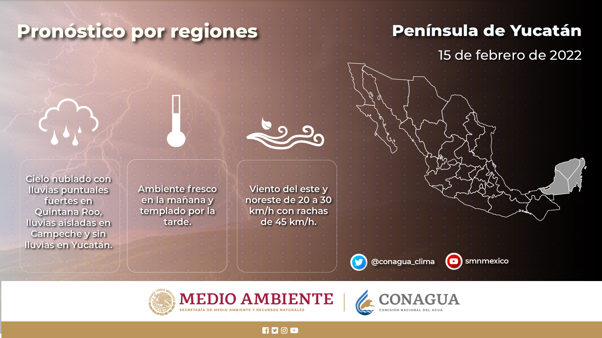 Península de Yucatán: Cielo nublado con lluvias puntuales fuertes en Quintana Roo, lluvias aisladas en Campeche y sin lluvias en Yucatán. Ambiente fresco en la mañana y templado por la tarde. Viento del este y noreste de 20 a 30 km/h con rachas de 45 km/h.