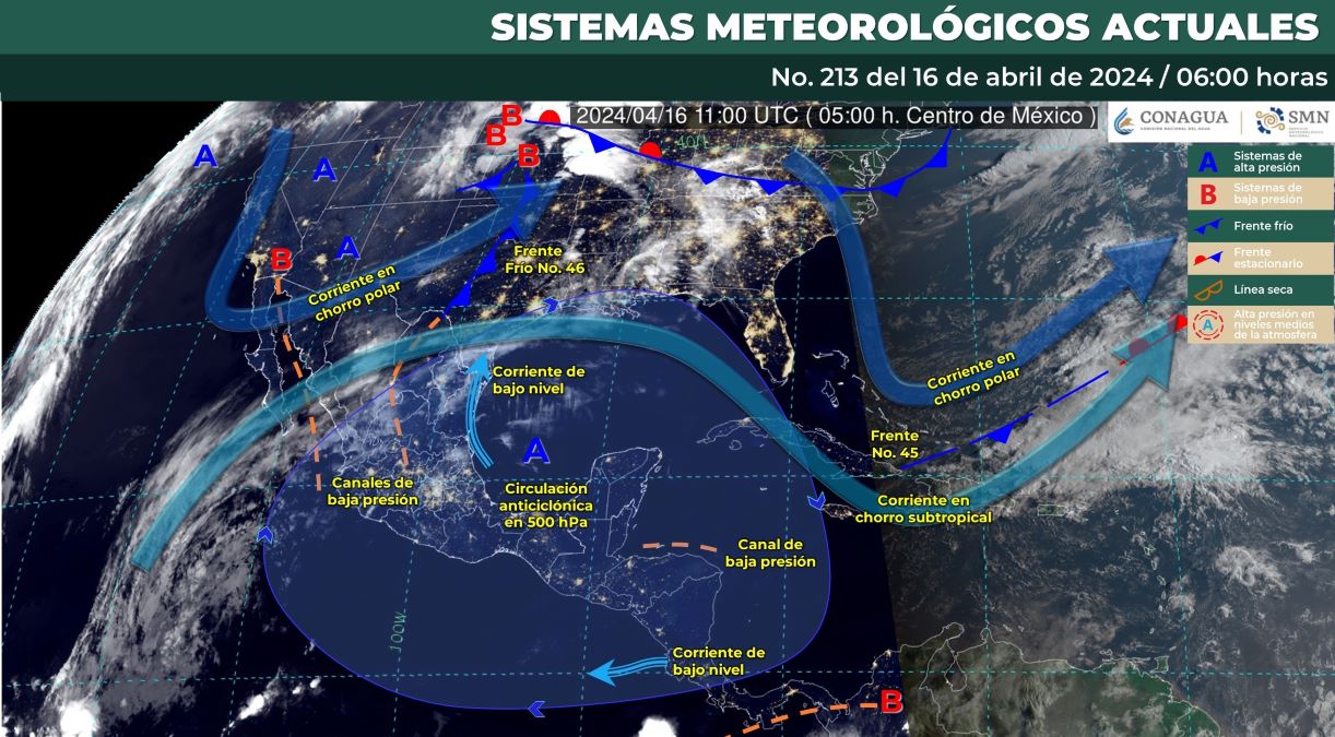 A su vez, el frente frío No. 46 se localizará sobre el norte y noreste de México, interaccionará con un canal de baja presión extendido sobre el noreste y oriente de la República Mexicana y con el ingreso de humedad generado por la corriente en chorro subtropical, ocasionarán lluvias y chubascos con descargas eléctricas y posible caída de granizo en las regiones mencionadas, rachas de viento fuertes a muy fuertes en el noroeste, norte y noreste del país, así como la posible formación de torbellinos en Tamaulipas.