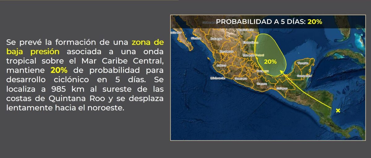 Por otra parte, la onda tropical 22, que recorrerá el sur del litoral del Pacífico y la entrada de humedad del mar Caribe y Golfo de México, generarán lluvias puntuales intensas en Oaxaca y Chiapas, puntuales fuertes en Tabasco, a muy fuertes en el oriente de la República Mexicana, así como chubascos en el noreste de México y estados de la Península de Yucatán.