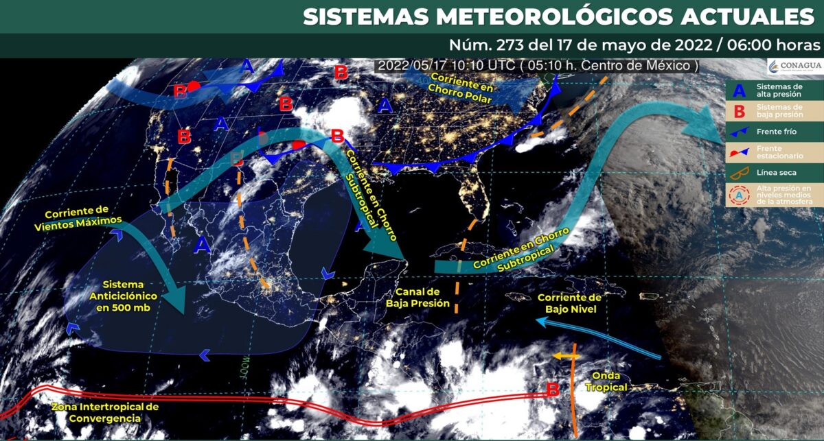 Por otra parte, canales de baja presión, sobre la Mesa del Norte y Mesa Central, y sobre el sureste del país, interaccionarán con la entrada de humedad del Océano Pacífico, Golfo de México y Mar Caribe, así como con inestabilidad en niveles altos de la atmósfera y originarán lluvias con chubascos en el norte, occidente y sureste del territorio nacional, además de la Península de Yucatán,