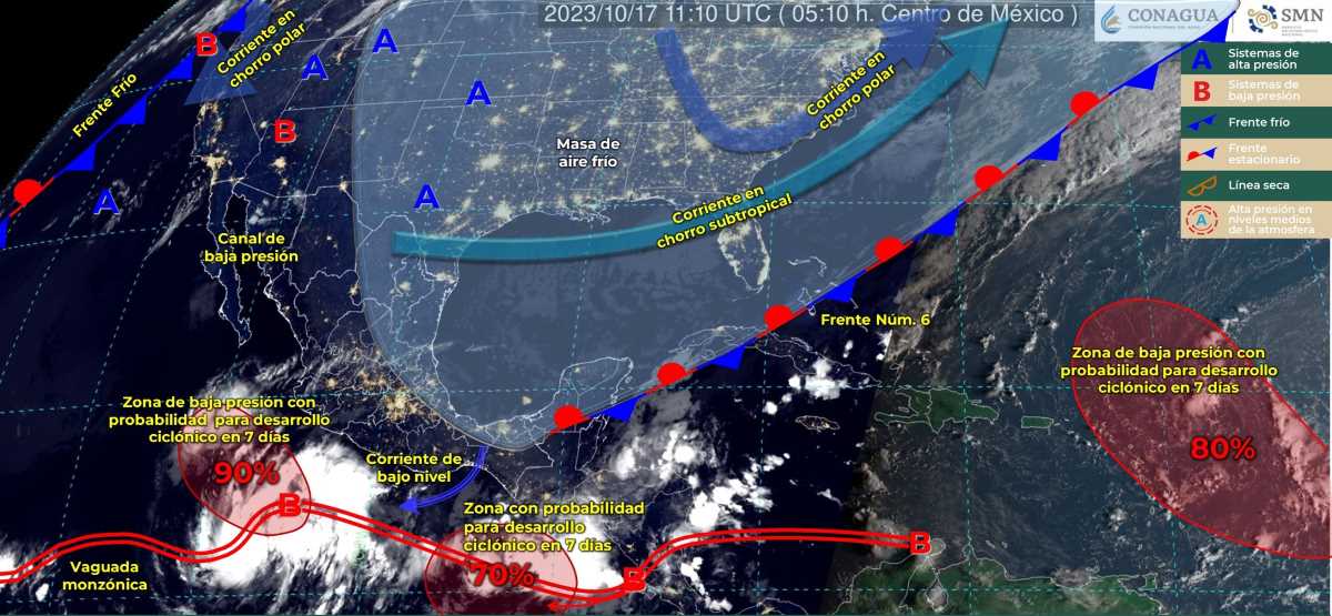 Pronóstico del clima para hoy martes 17 de octubre 2023 en Quintana Roo. Hoy martes, la zona de baja presión con alta probabilidad de desarrollo ciclónico o posible ciclón tropical se localizará al sur de las costas de Jalisco y Colima, sus desprendimientos nubosos incrementarán la probabilidad de lluvias fuertes a puntuales muy fuertes en el occidente y sur del país.