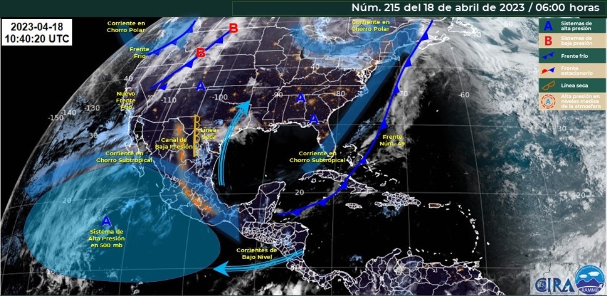 Asimismo, se pronostica la aproximación de un nuevo frente frío al noroeste de México, provocando fuertes rachas de viento en dicha región.