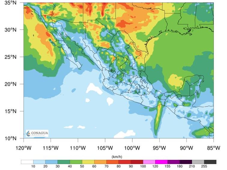 Pacífico Sur: Cielo parcialmente nublado en la mañana y medio nublado por la tarde con probabilidad de chubascos acompañados de descargas eléctricas en Chiapas y Oaxaca, así como lluvias aisladas en Guerrero. Ambiente fresco a templado por la mañana y muy caluroso por la tarde. Viento de componente norte de 15 a 30 km/h con rachas de 50 a 60 km/h en el Istmo y Golfo de Tehuantepec. Viento de componente sur con rachas de 50 a 60 km/h en Guerrero.