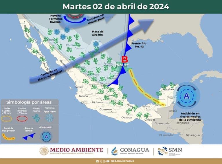 Al final del día, la novena tormenta invernal se moverá hacia el centro de Estados Unidos y dejará de afectar a México; por otra parte, el frente frío No. 43 recorrerá el noreste del país e ingresará al Golfo de México, y en interacción con un canal de baja presión ubicado sobre el sur de dicho golfo, generará lluvias e intervalos de chubascos.