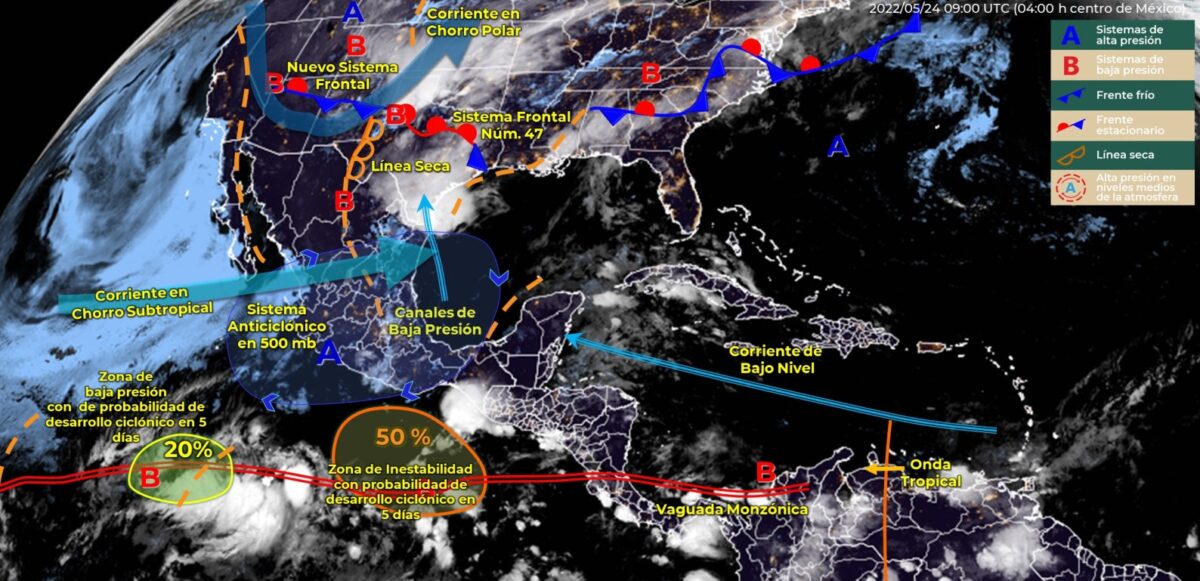 Pronóstico del clima para hoy martes 24 de mayo en Quintana Roo. Para este día, se pronostica la aproximación de un nuevo sistema frontal a la frontera norte de México, en interacción con una línea seca al norte de Coahuila, con un canal de baja presión que se establecerá sobre el norte y centro del territorio nacional, con la corriente en chorro polar y con inestabilidad en niveles altos de la atmósfera, ocasionarán lluvias y chubascos en el noreste y oriente de la República Mexicana, siendo puntuales fuertes en el centro del país, incluyendo al Valle de México.
