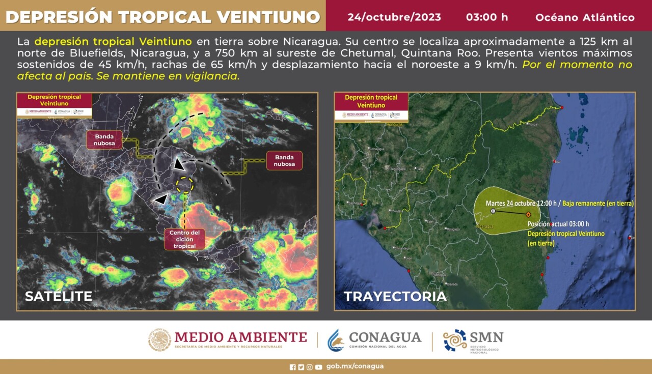 Asimismo, la depresión tropical 21 se desplazará sobre Centroamérica, su circulación favorecerá el ingreso de humedad del Mar Caribe hacia la Península de Yucatán, ocasionará lluvias fuertes a muy fuertes en dicha región.