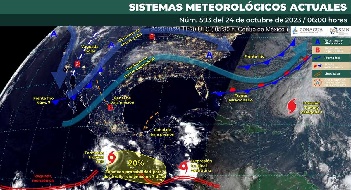 Pronóstico del clima para hoy martes 24 de octubre 2023 en Quintana Roo. Este día, la tormenta tropical “Otis” podría intensificarse a huracán de categoría 1 en la escala Saffir-Simpson frente a las costas de Guerrero y Oaxaca, sus bandas nubosas producirán lluvias intensas a torrenciales en Guerrero, Oaxaca y Chiapas, así como lluvias fuertes a muy fuertes en el centro y oriente del país.