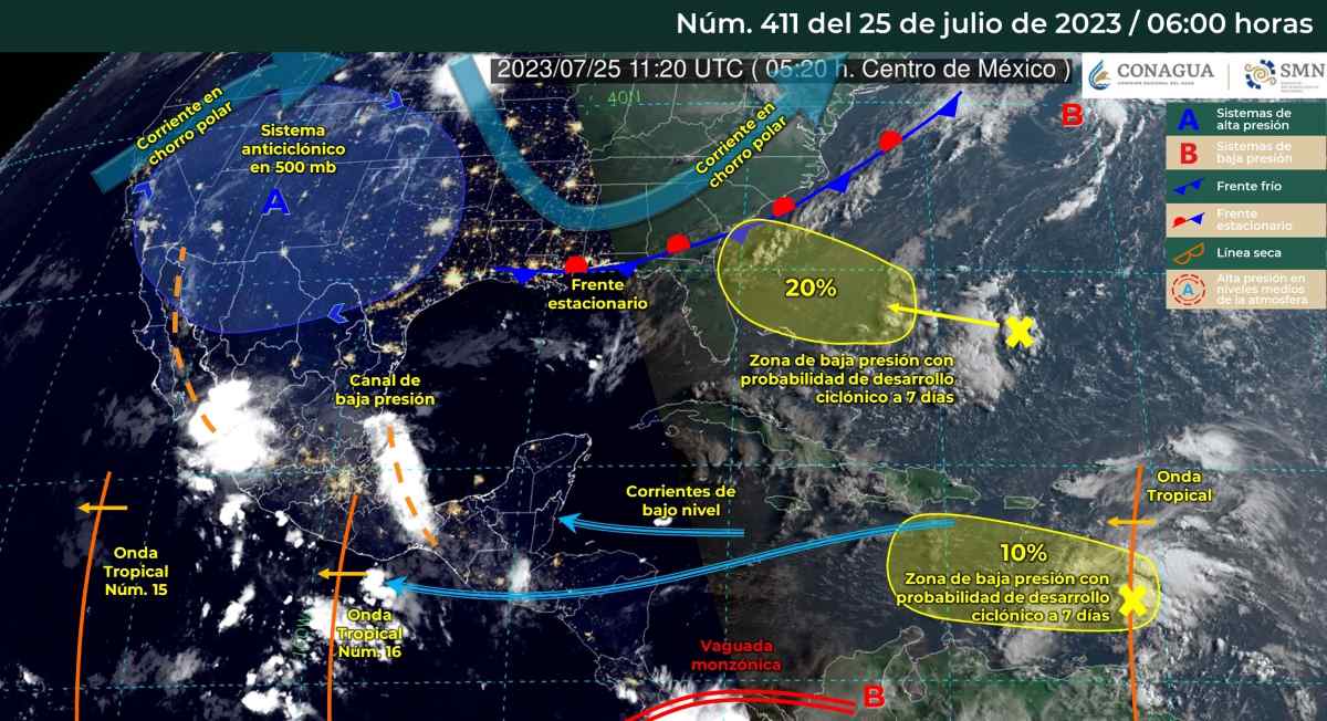 Pronóstico del clima para hoy martes 25 de julio 2023 en Quintana Roo. Hoy martes, la onda tropical número 16 recorrerá el occidente del territorio nacional, en interacción con la afluencia de humedad del océano Pacífico, ocasionarán lluvias puntuales intensas en Nayarit, Jalisco y Colima.