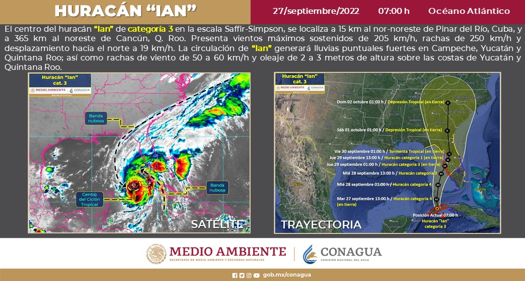 Por su parte, el huracán «Ian», se desplazará sobre el oriente del Golfo de México ocasionando lluvias puntuales fuertes en la Península de Yucatán, así como viento de componente norte con rachas de 50 a 60 km/h y olas de 2 a 3 metros de altura en las costas de la mencionada Península.