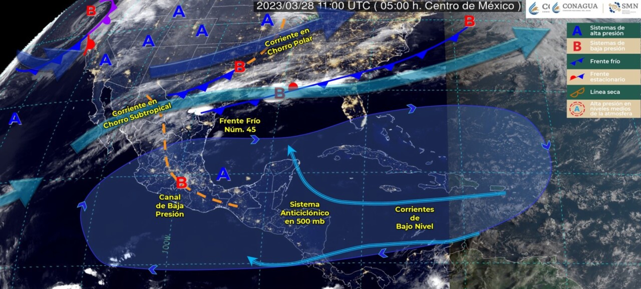 Pronóstico del clima para hoy martes 28 de marzo 2023 en Quintana Roo. Este día, el frente frío número 45 se localizará sobre el noreste del país e interaccionará con la corriente en chorro subtropical y con un canal de baja presión, los cuales originarán lluvias puntuales intensas en Nuevo León y Tamaulipas, así como lluvias puntuales muy fuertes en Coahuila.