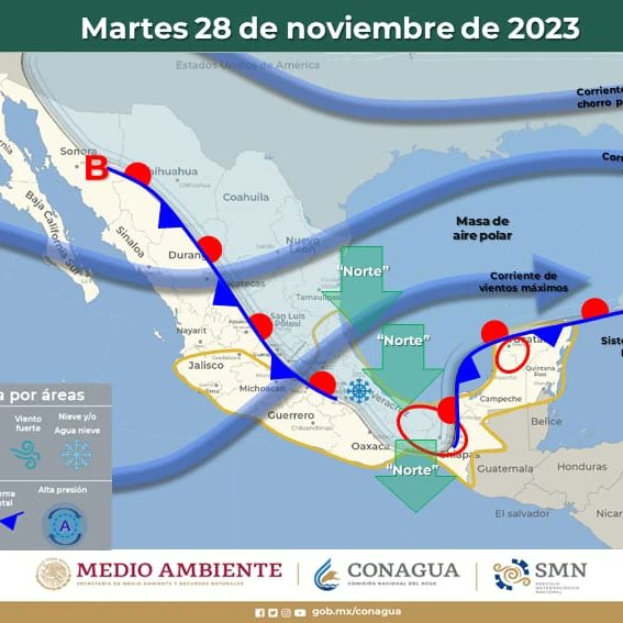 Por su parte la masa de aire polar asociada, mantendrá evento de “Norte” muy fuerte a intenso, con rachas de 80 a 100 km/h en el Istmo y oleaje de 3 a 5 metros de altura en el litoral de Veracruz y costas del Golfo de Tehuantepec; y “Norte” moderado a fuerte, con rachas de 40 a 60 km/h y olas de 1 a 3 metros de altura en las costas de Tamaulipas, Campeche, Yucatán y Quintana Roo.
