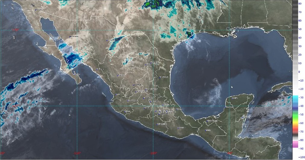 Golfo de México: Cielo parcialmente nublado y sin lluvia en Tamaulipas, Veracruz y Tabasco. Ambiente matutino fresco a frío. Temperaturas muy frías con heladas al amanecer en zonas montañosas de Veracruz. Por la tarde, ambiente cálido a caluroso. Viento de dirección variable de 20 a 35 km/h en la región y evento de “surada” con rachas de 50 a 70 km/h en costas de Tamaulipas y Veracruz.