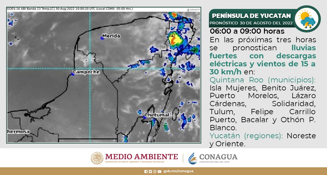 Península de Yucatán: Cielo nublado durante el día. Lluvias puntuales intensas en Campeche y Yucatán y puntuales muy fuertes en Quintana Roo; todas con descargas eléctricas. Ambiente cálido por la tarde y viento del noreste de 10 a 20 km/h en la región, con rachas de 40 a 50 km/h en zonas de Campeche y Yucatán.
