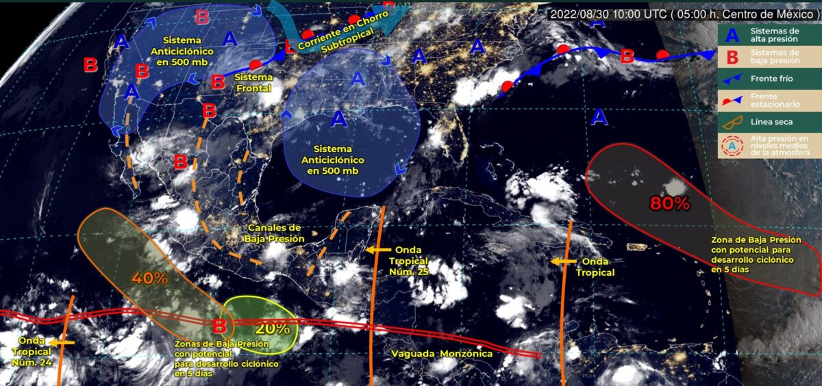 La onda tropical número 25 del mar Caribe se localizó esta mañana su eje frente a la costa oriental de la Península de Yucatán, Honduras, El Salvador y más al sur sobre el océano Pacífico.