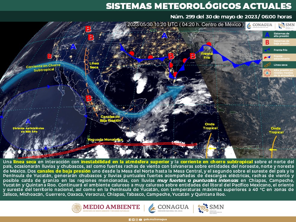 Pronóstico del clima para hoy martes 30 de mayo 2023 en Quintana Roo. Para este día, una línea seca en interacción con inestabilidad en la atmósfera superior y la corriente en chorro subtropical sobre el norte del país, ocasionarán lluvias y chubascos, así como fuertes rachas de viento con tolvaneras sobre entidades del noroeste, norte y noreste de México.
