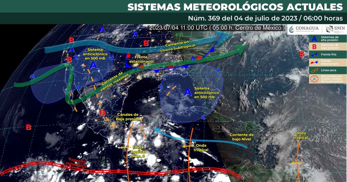 Pronóstico del clima para hoy martes 4 de julio 2023 en Quintana Roo. Este día, un canal de baja presión en el sureste mexicano y el paso de la onda tropical número 9 sobre el sur del territorio nacional, aunado al ingreso de humedad del Océano Pacífico, Golfo de México y Mar Caribe, producirán lluvias puntuales intensas en Oaxaca y Chiapas; así como lluvias fuertes a muy fuertes en el sur, sureste y oriente del país.