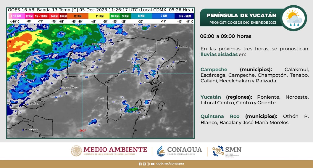 Pronóstico del clima para hoy martes 5 de diciembre 2023 en Quintana Roo. Para este día, el frente número 13 se mantendrá con características de estacionario sobre la Península de Yucatán, e interaccionará con un canal de baja presión en el suroeste del Golfo de México y el sureste del país; aunado al ingreso de humedad generado por la corriente en chorro subtropical, producirán lluvias puntuales torrenciales en Veracruz (sur), Chiapas y Tabasco, además de lluvias muy fuertes a intensas en Oaxaca y la Península de Yucatán.