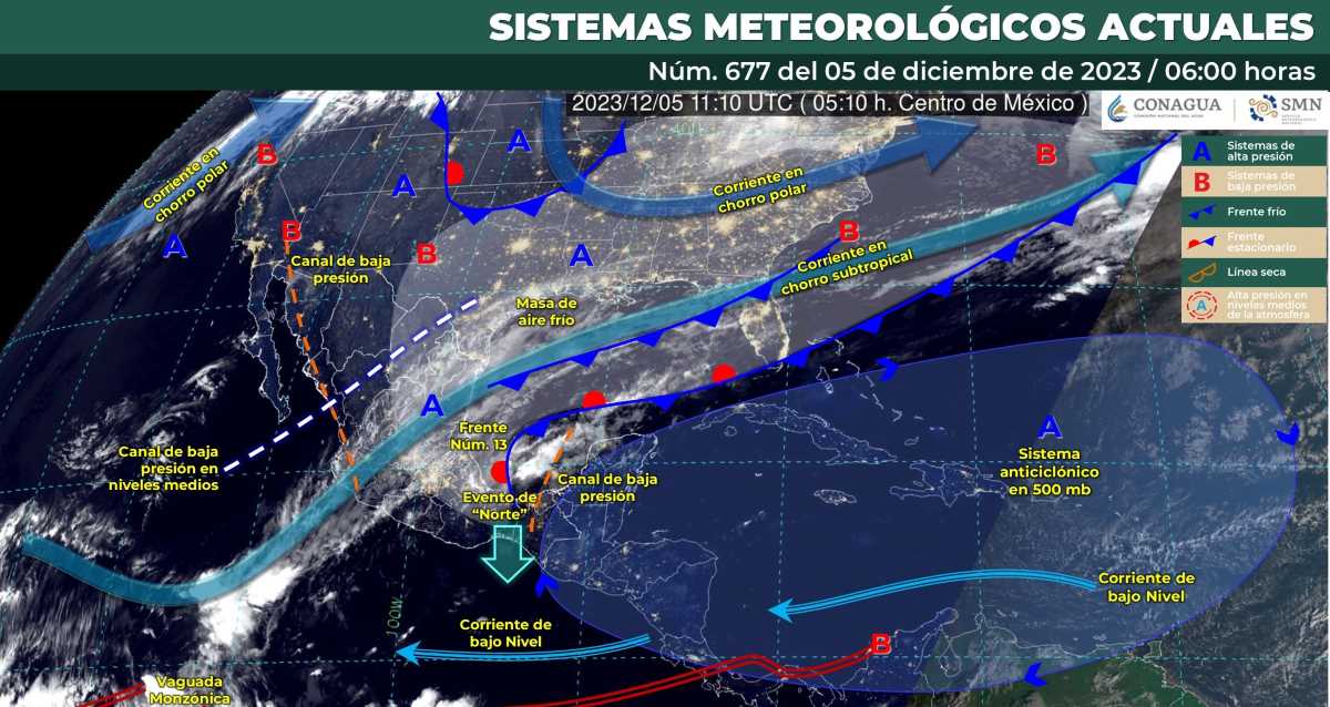 Pronóstico del clima para hoy martes 5 de diciembre 2023 en Quintana Roo. Para este día, el frente número 13 se mantendrá con características de estacionario sobre la Península de Yucatán, e interaccionará con un canal de baja presión en el suroeste del Golfo de México y el sureste del país; aunado al ingreso de humedad generado por la corriente en chorro subtropical, producirán lluvias puntuales torrenciales en Veracruz (sur), Chiapas y Tabasco, además de lluvias muy fuertes a intensas en Oaxaca y la Península de Yucatán.