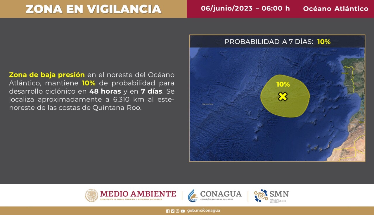 Pronóstico del clima para hoy martes 6 de junio 2023 en Quintana Roo.- Este día, un canal de baja presión se extenderá sobre la Mesa del Norte, la Mesa Central y el sureste de México, en interacción con inestabilidad en la atmósfera superior y con el ingreso de humedad del Océano Pacífico, Golfo de México y Mar Caribe, originarán lluvias puntuales muy fuertes en Chiapas, Tabasco, Campeche, Yucatán y Quintana Roo; así como chubascos y lluvias fuertes en el norte, noreste, oriente, occidente, centro, sur y sureste del país, incluidos el Valle de México y la Península de Yucatán.