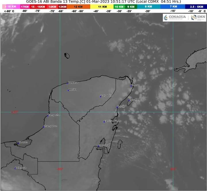 Península de Yucatán: Cielo parcialmente nublado por la mañana y medio nublado por la tarde con probabilidad de lluvias aisladas en Quintana Roo; sin lluvia en Campeche y Yucatán. Ambiente matutino templado y muy caluroso por la tarde. Viento de componente sur (Surada) con rachas de 50 a 70 km/h en la región.