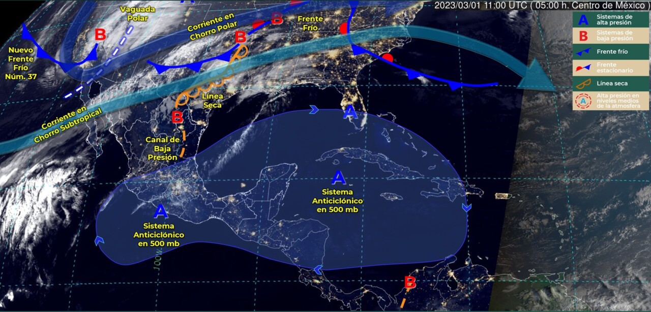 Pronóstico del clima para hoy miércoles 1 de marzo 2023 en Quintana Roo. Para este día, el nuevo frente frío número 37 ingresará sobre el noroeste del país, interaccionará con una vaguada polar y con las corrientes en chorro polar y subtropical, propiciarán lluvias puntuales fuertes en Baja California y Sonora, dichas lluvias podrían incrementar los niveles de ríos y arroyos, así como deslaves e inundaciones en zonas bajas de esos estados.