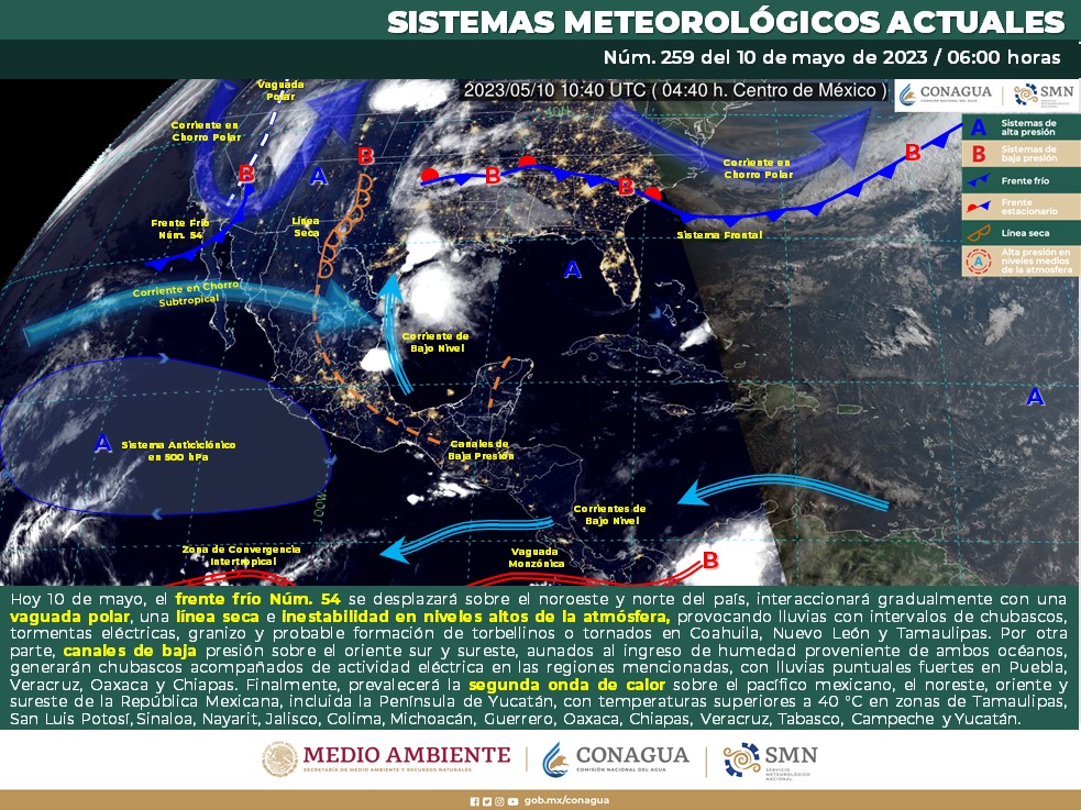 Pronóstico del clima para hoy miércoles 10 de mayo 2023 en Quintana Roo. Este día, el frente frío Núm. 54 se desplazará sobre el noroeste y norte del país, interaccionará gradualmente con una vaguada polar, una línea seca e inestabilidad en niveles altos de la atmósfera, provocando lluvias con intervalos de chubascos, tormentas eléctricas, granizo y probable formación de torbellinos o tornados en Coahuila, Nuevo León y Tamaulipas.