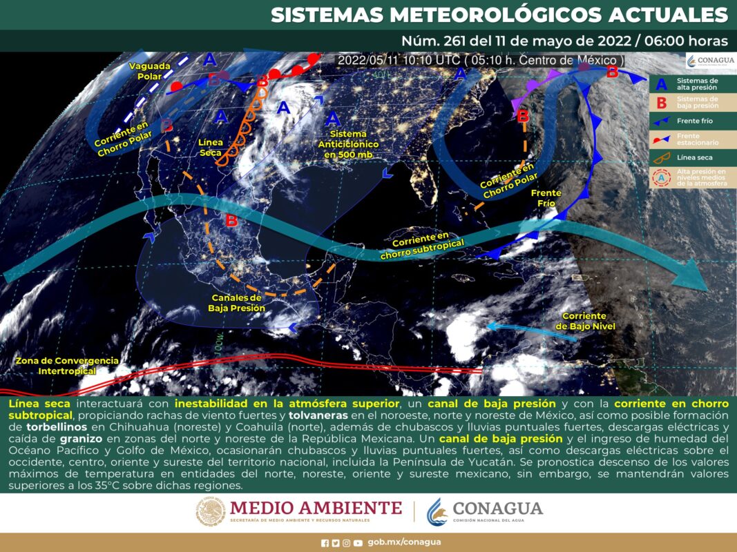 Pronóstico del clima para hoy miércoles 11 de mayo en Quintana Roo. Este día, una línea seca sobre el norte de México, interactuará con inestabilidad en la atmósfera superior, un canal de baja presión sobre la Mesa del Norte y la corriente en chorro subtropical, propiciando rachas de viento fuertes y tolvaneras en el noroeste, norte y noreste de México.