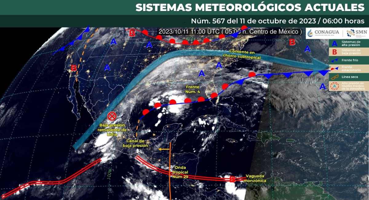 Pronóstico del clima para hoy miércoles 11 de octubre 2023 en Quintana Roo. Hoy, los remanentes del ciclón tropical “Lidia” se localizarán en tierra sobre el occidente del país, y mantendrán interacción con la corriente en chorro subtropical, propiciarán lluvias puntuales muy fuertes en Sinaloa, Nayarit, Jalisco, Colima, Michoacán y Zacatecas; lluvias puntuales fuertes en Durango y chubascos en el norte y centro de México.