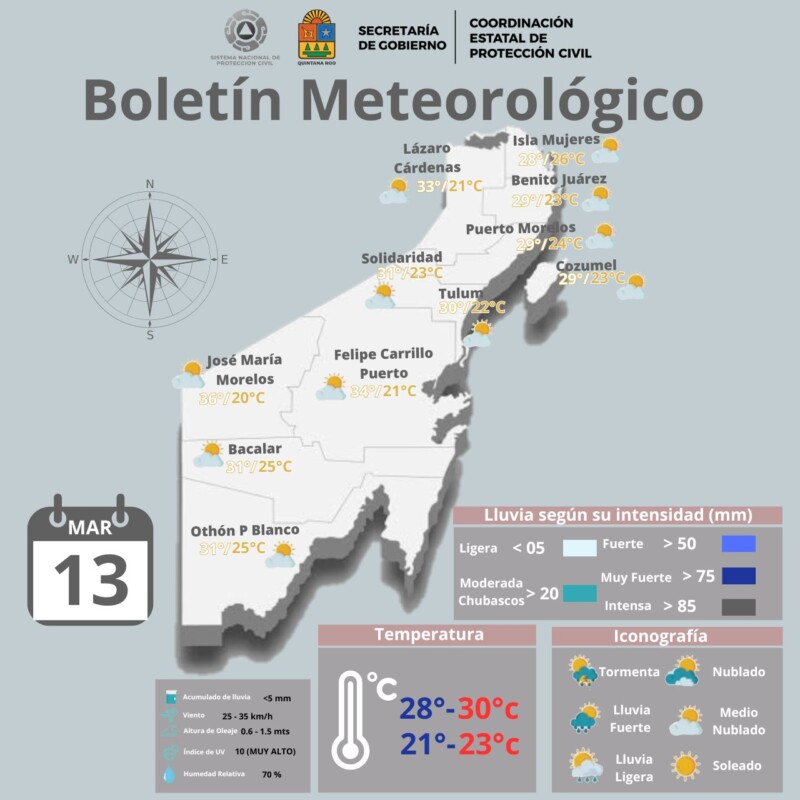 Pronóstico del clima para hoy miércoles 13 de marzo de 2024 en Quintana Roo. Este día, una línea seca se extenderá sobre Coahuila, en interacción con un canal de baja presión extendido desde el noreste hasta el centro del país, el ingreso de humedad del Océano Pacífico y Golfo de México, y con la corriente en chorro subtropical, originarán lluvias e intervalos de chubascos en Coahuila, Nuevo León, Tamaulipas, Oaxaca y Chiapas. Además de lluvias aisladas en el centro de México y Península de Yucatán, así como rachas de 70 a 90 km/h con posibles tolvaneras en Chihuahua y Durango.