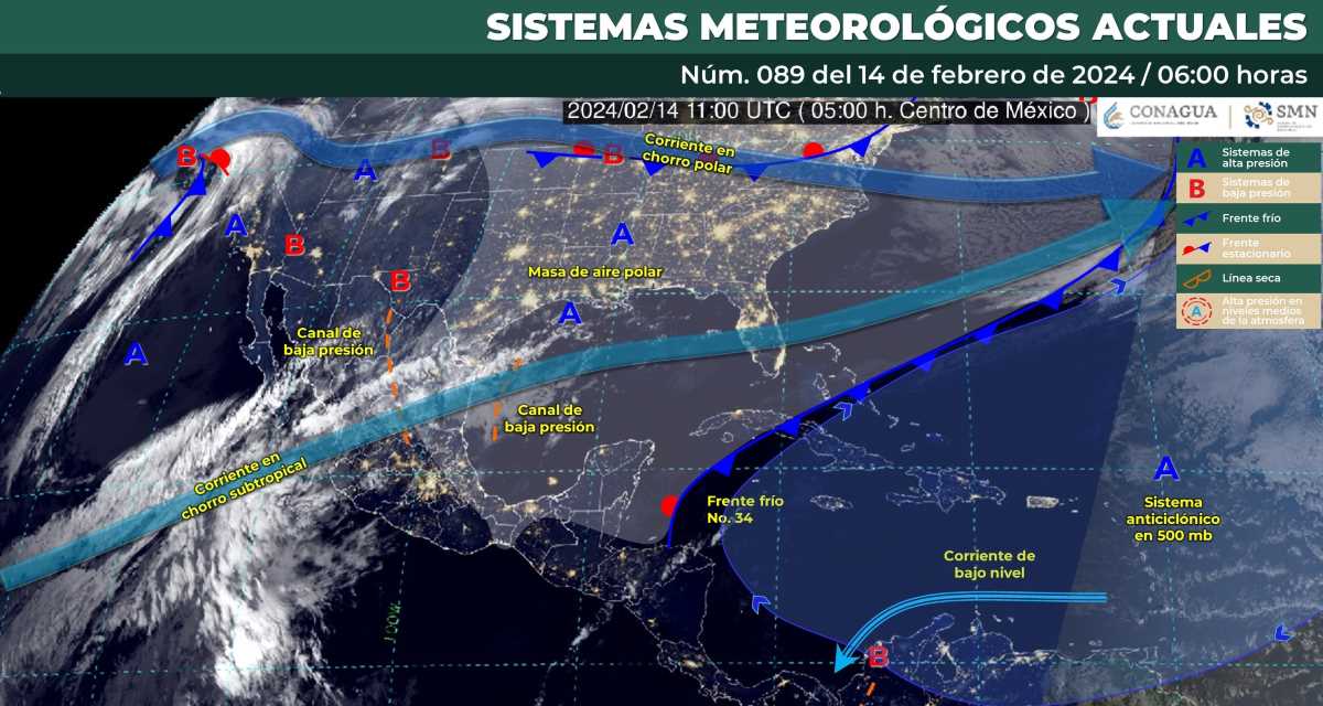 Finalmente, el frente frío 34 ha dejado de afectar al país, mientras que la masa de aire polar asociada modificará sus características térmicas, lo que permitirá el ascenso de las temperaturas vespertinas en el noreste, centro, oriente y sureste del territorio nacional.