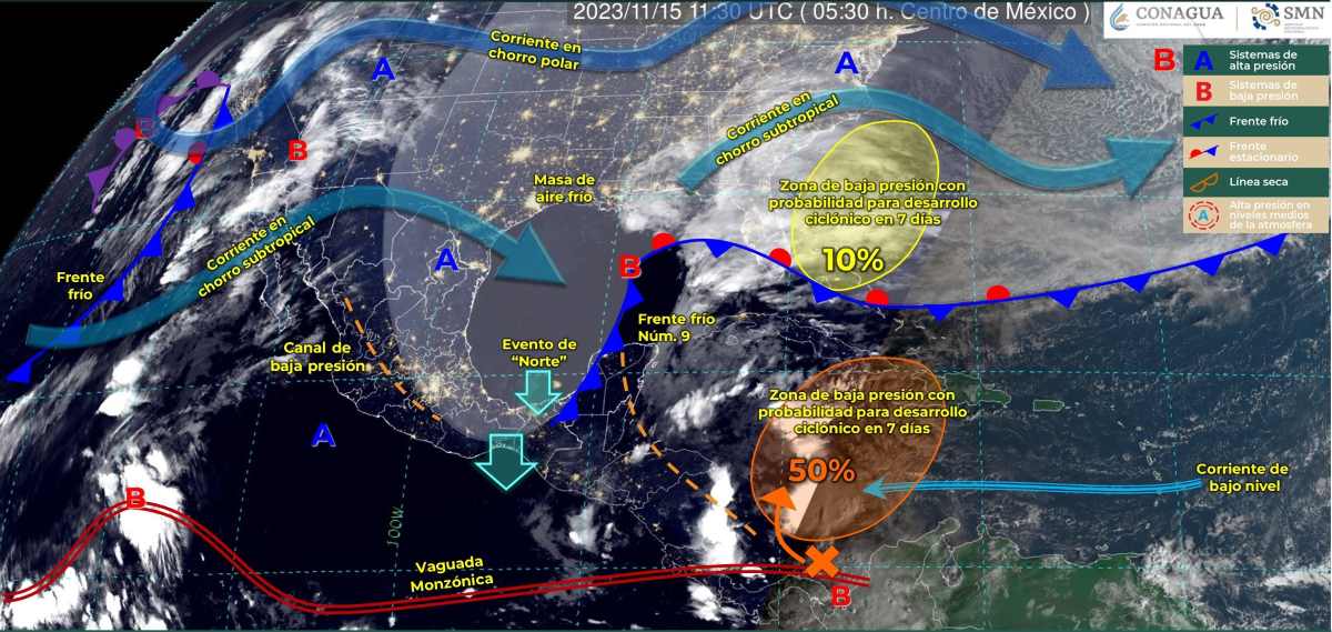 La masa de aire frío asociada al frente, continuará generando evento de “norte” fuerte a muy fuerte en Veracruz, Tabasco, Península de Yucatán, Istmo y Golfo de Tehuantepec.