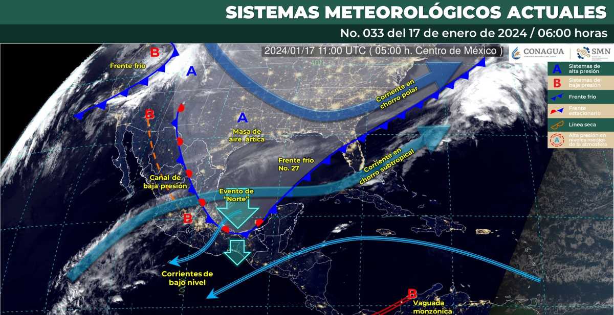 Evento de “Norte” con rachas de viento de 80 a 100 km/h: Istmo de Tehuantepec; con oleaje de 2 a 4 metros de altura: Golfo de Tehuantepec y costa sur de Veracruz; con rachas de 50 a 70 km/h: costas de Tamaulipas y con oleaje de 1 a 3 metros de altura en: Tabasco, Campeche, Yucatán y Quintana Roo.