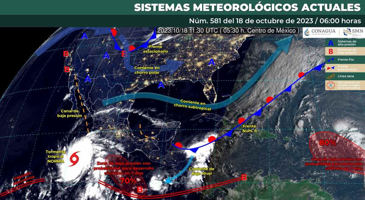 Pacífico Sur: Lluvias matutinas en la costa de Guerrero. Cielo medio nublado a nublado durante el día, con lluvias puntuales intensas en Guerrero, puntuales fuertes en Chiapas e intervalos de chubascos en Oaxaca, todas con descargas eléctricas, y las lluvias fuertes e intensas podrían ocasionar encharcamientos, deslaves, inundaciones e incrementar los niveles de ríos y arroyos; así como visibilidad reducida en tramos carreteros. Ambiente frío por la mañana con bancos de niebla en zonas montañosas y fresco a templado por la tarde.