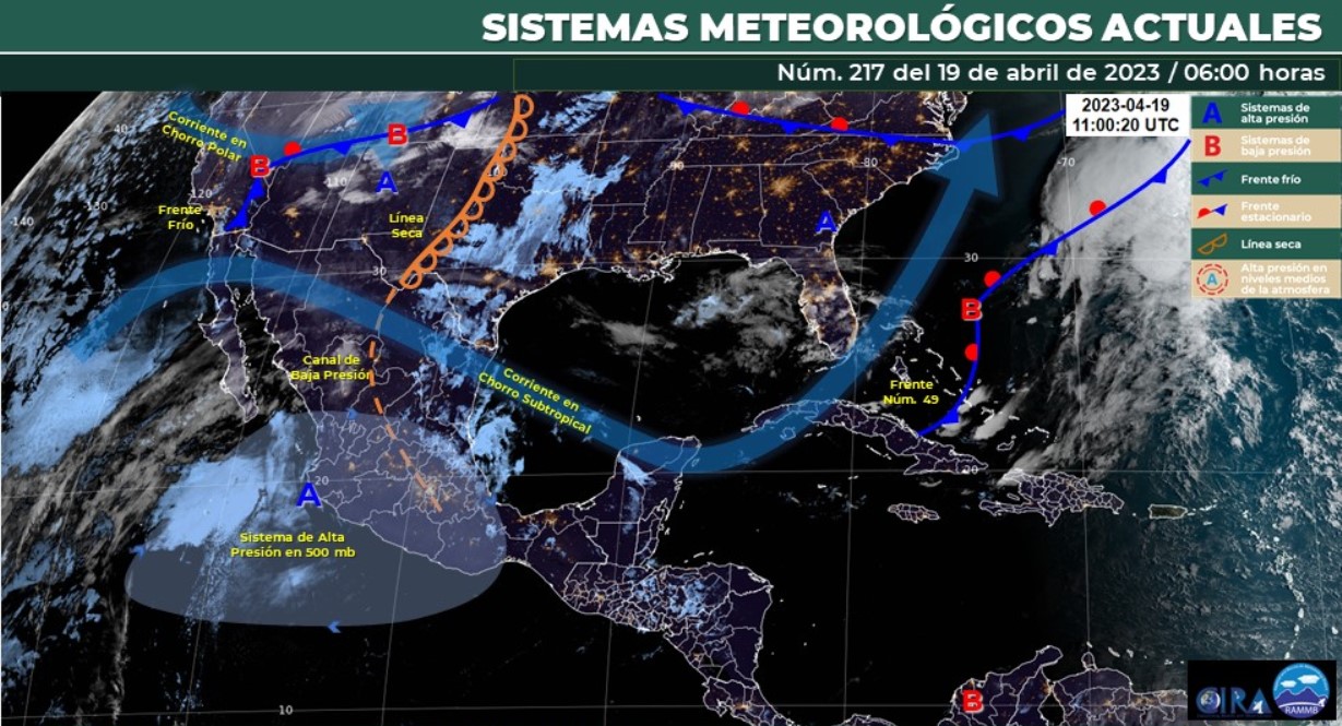 Por otra parte, un nuevo frente frío (de corta duración) se extenderá sobre la frontera noroeste de México e interaccionará con la corriente en chorro subtropical, generando fuertes rachas de viento con tolvaneras en dicha región.