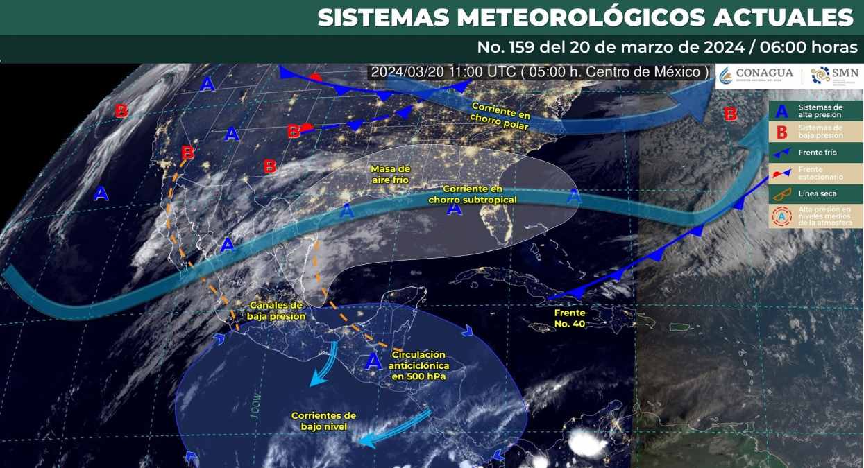 Pronóstico del clima para hoy miércoles 20 de marzo de 2024 en Quintana Roo. Este día, un canal de baja presión sobre la Mesa del Norte interaccionará con el ingreso de humedad del Océano Pacífico generado por la corriente en chorro subtropical, ocasionando fuertes rachas de viento en la región mencionada, así como lluvias y chubascos en el norte y noreste de la República Mexicana.