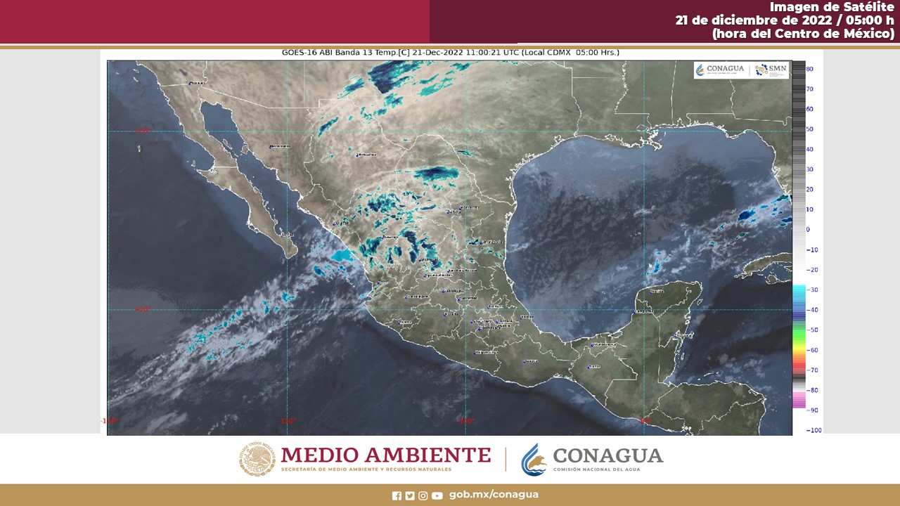 Golfo de México: Cielo medio nublado a nublado con lluvias puntuales muy fuertes en Veracruz y Tabasco, y sin lluvias en Tamaulipas. Ambiente fresco por la mañana, y frío con bancos de niebla y posibles heladas en zonas altas de Tamaulipas y Veracruz. Por la tarde, ambiente templado a cálido. Evento de “Norte” de 50 a 70 km/h y oleaje de 1 a 3 metros de altura en la costa sur de Veracruz.