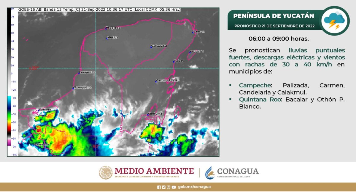 Península de Yucatán: Cielo medio nublado a nublado durante el día con lluvias fuertes en Campeche e intervalos de chubascos en Yucatán y Quintana Roo; todas con descargas eléctricas. Ambiente templado por la mañana y caluroso por la tarde. Viento de componente norte de 10 a 20 km/h en la región, con rachas de hasta 40 km/h en zonas costeras.