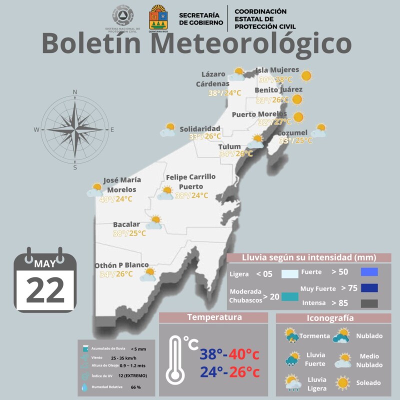 Pronóstico del clima para hoy miércoles 22 de mayo 2024 en Quintana Roo; cielo medio nublado con lluvias aisladas en Yucatán y Quintana Roo.