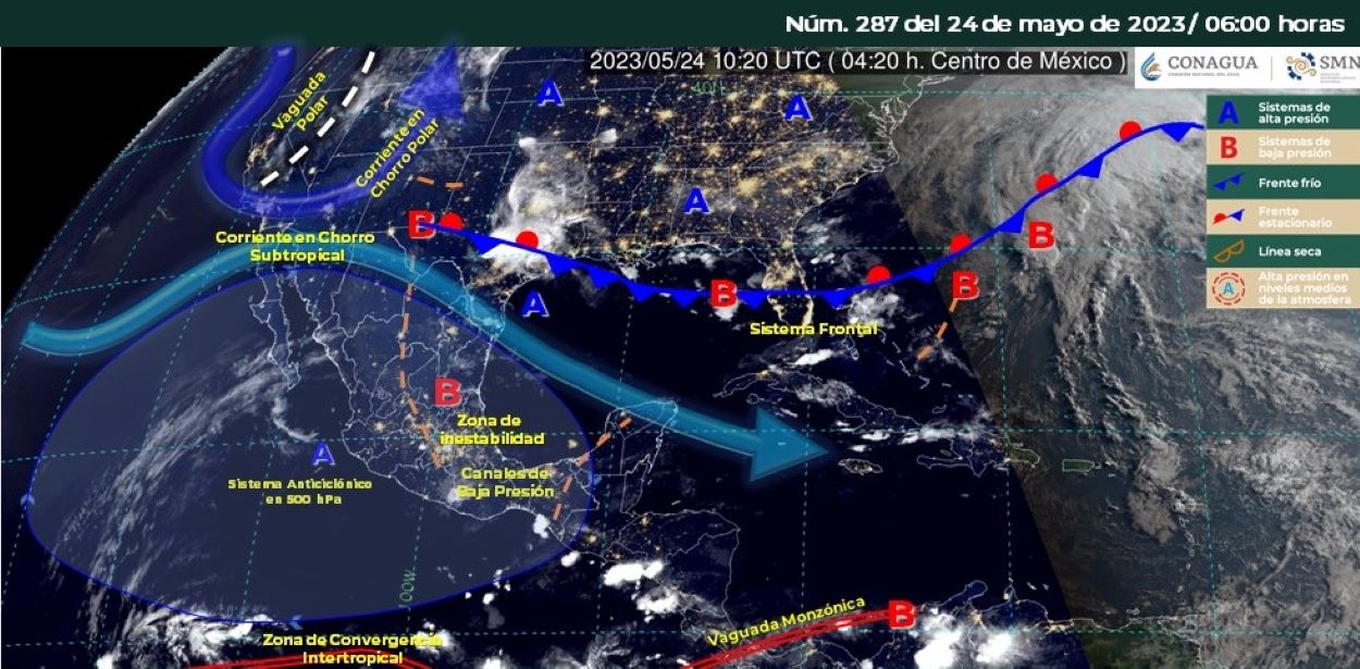 Pronóstico del clima para hoy miércoles 24 de mayo 2023 en Quintana Roo. Para este día, un canal de baja presión desde la Mesa del Norte hasta la Mesa Central, en combinación con la corriente en chorro subtropical, propiciarán lluvias con chubascos, descargas eléctricas y posible caída de granizo en zonas del norte y noreste de México, además de rachas de viento de hasta 70 km/h, probable formación de tolvaneras y torbellinos o tornados en Coahuila y Nuevo León.