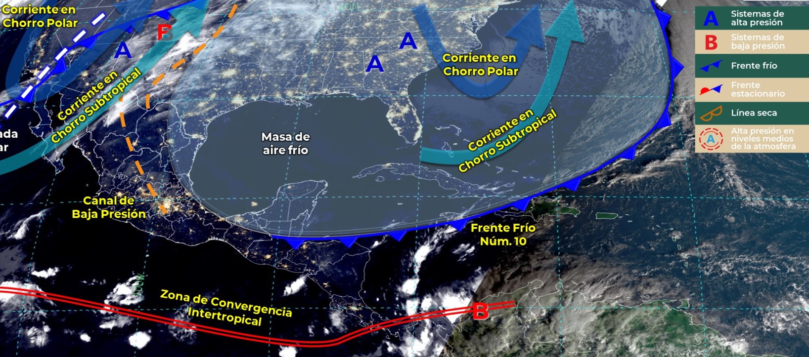 Al final del día, un nuevo frente frío se aproximará al norte de México, generando nuevo descenso de temperatura sobre dicha región.