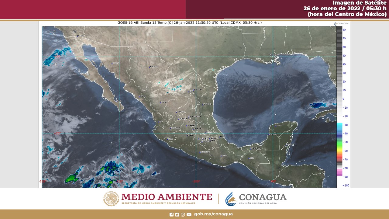 Golfo de México: Cielo nublado durante el día con lluvias puntuales fuertes por la tarde en Tabasco y el sur de Veracruz, así como intervalos de chubascos en Tamaulipas. Ambiente matutino fresco a templado. Temperaturas frías en zonas serranas. Heladas y bancos de niebla al amanecer en zonas altas de Veracruz. Temperaturas vespertinas templadas a cálidas. Viento del norte y noreste de 10 a 25 km/h en la región, con rachas de 40 a 50 km/h en costas de Veracruz y Tabasco.