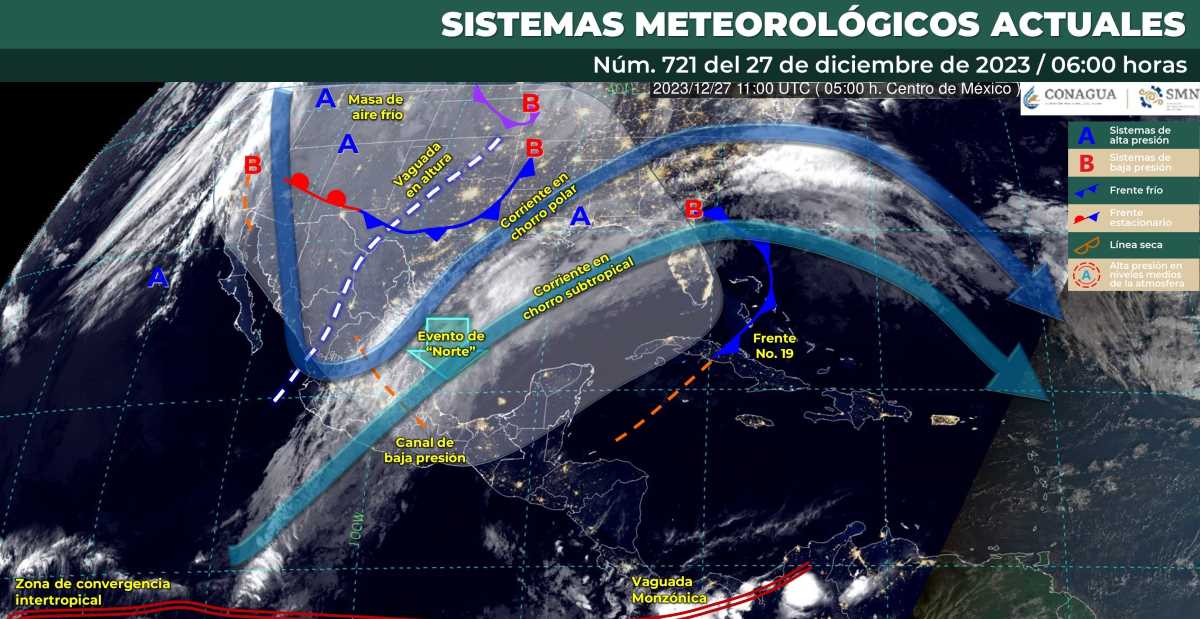 Pronóstico del clima para hoy miércoles 27 de diciembre 2023 en Quintana Roo. Este día, la masa de aire frío asociada al frente frío 19 será reforzada por una masa de aire polar, en interacción con la corriente en chorro subtropical, un canal de baja presión extendido en el interior del territorio nacional y una vaguada en niveles altos de la atmósfera, ocasionarán lluvias puntuales intensas en Puebla y Veracruz, lluvias muy fuertes en Oaxaca, Chiapas, Tabasco y la Península de Yucatán, así como chubascos y lluvias fuertes en el oriente y sureste del país.